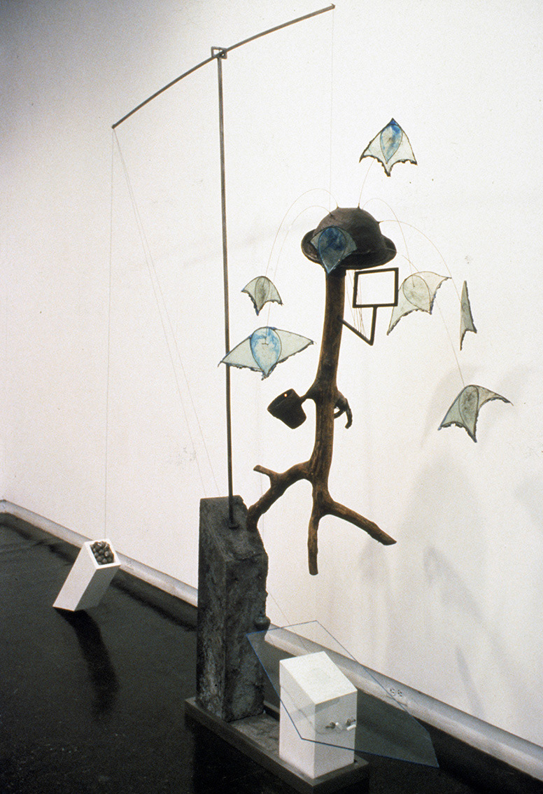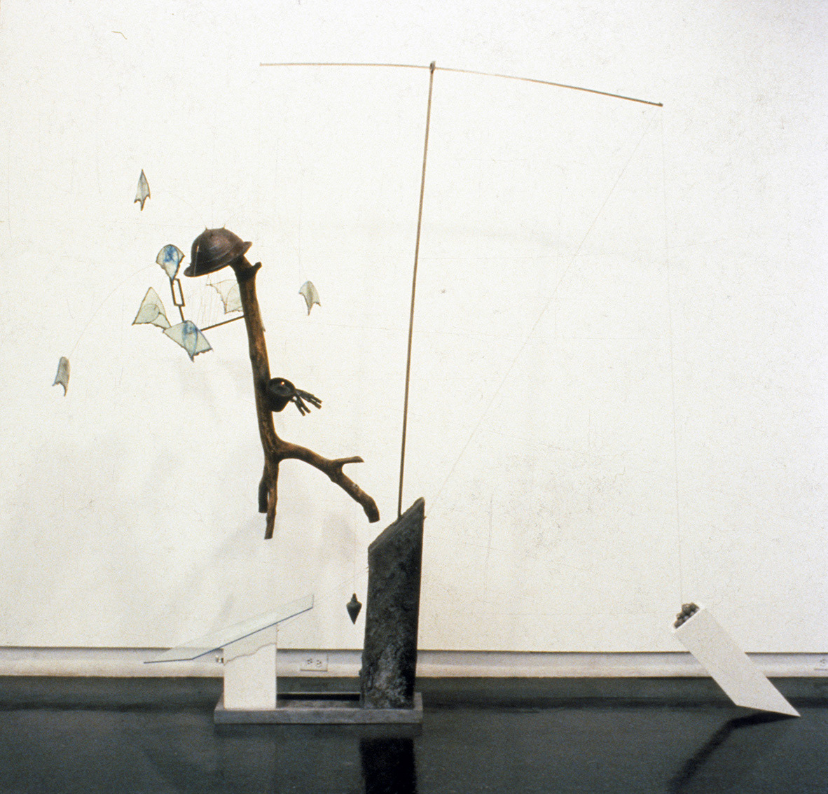 As the title suggests this is in balance. Cast aluminium, steel, wood, plaster and lightbulb etc.